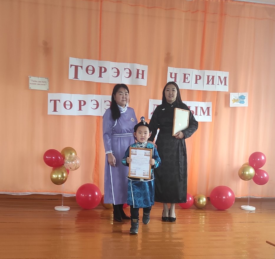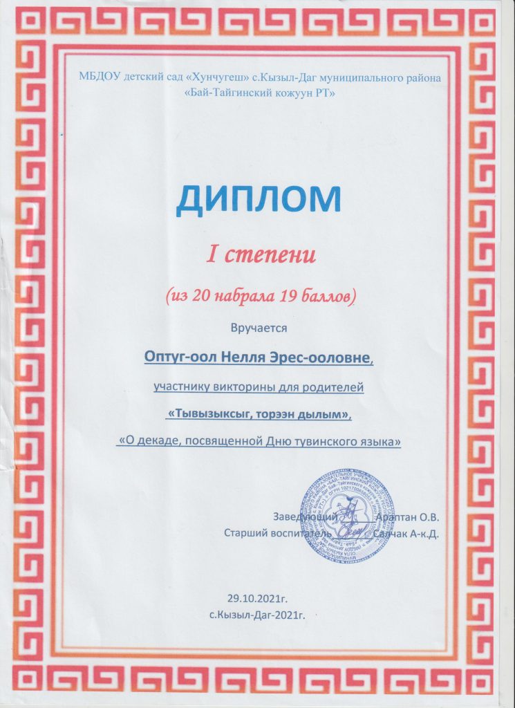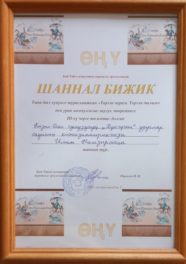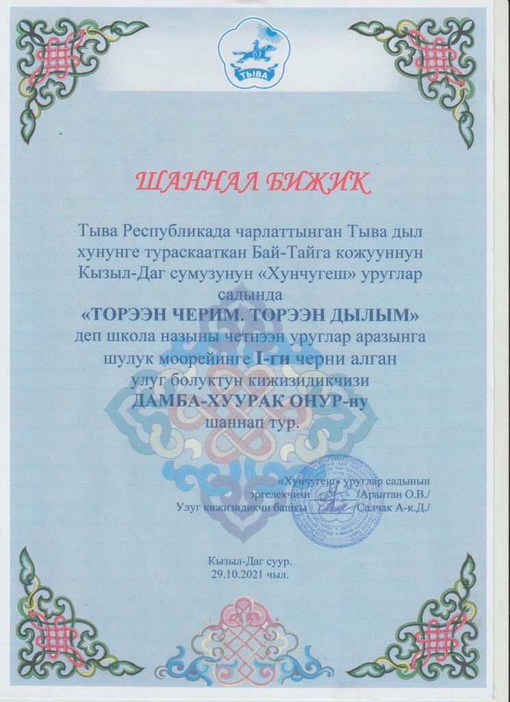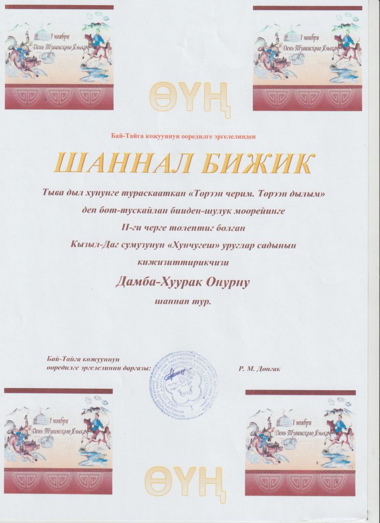 Тыва дыл хунунге тураскааткан «Торээн черим. Торээн дылым» деп бот-тускайлан бииден-шулук моорейинге II-ги черге толептиг болган Кызыл-Даг сумузунун «Хунчугеш» уруглар садынын кижизиттирикчизи Дамба-Хуурак Онурну шаннап тур.